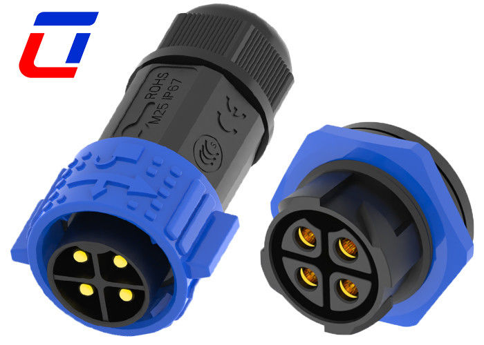 Este conector circular de energía M25 tiene una clasificación de resistencia al agua de IP67.Una vez que cada lado está conectadoEl cableado está totalmente protegido de los elementos. Si se necesita una versión de soldadura, también se puede utilizar.